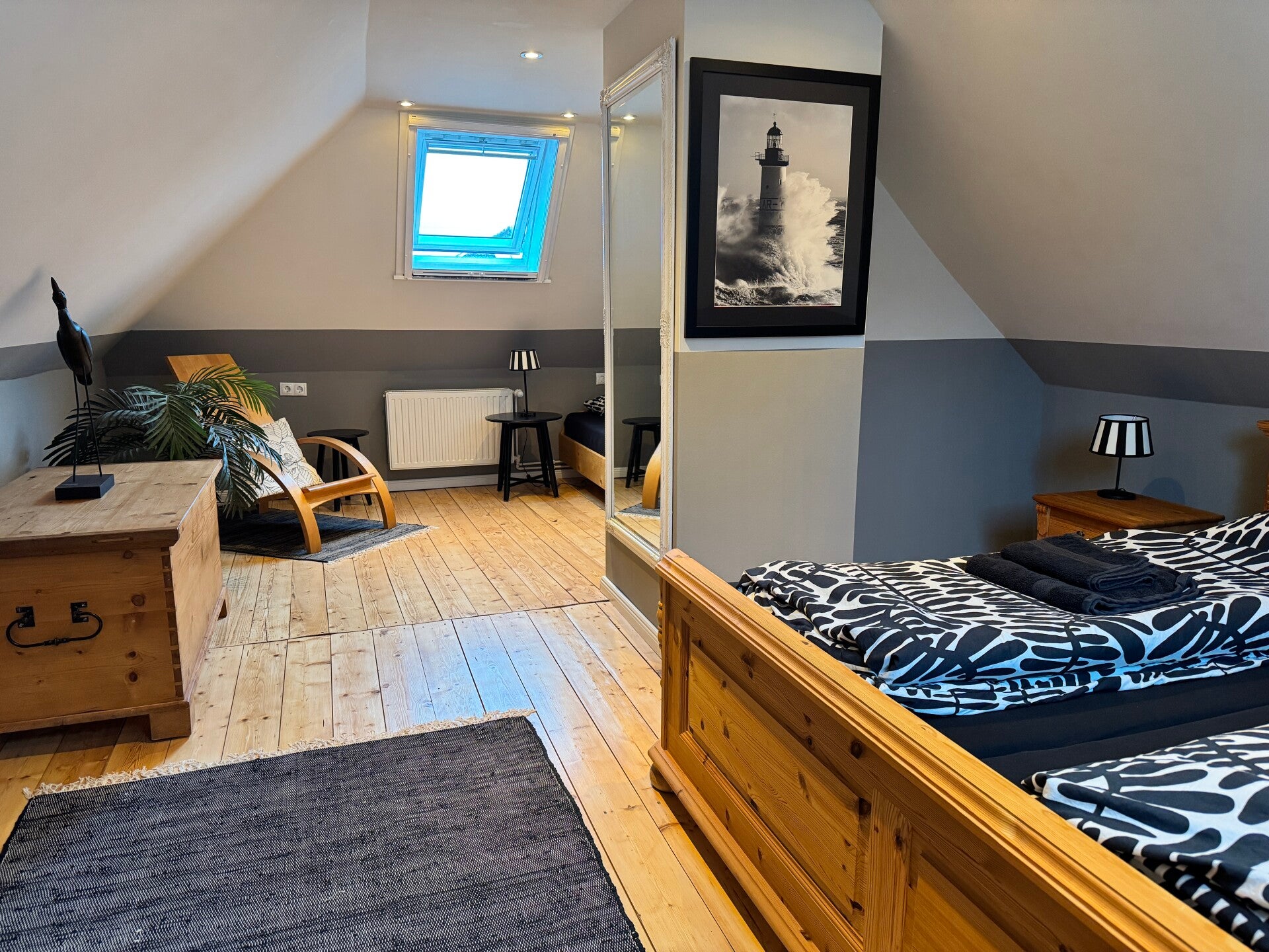 Eine steile halboffene Treppe führt ins Obergeschoß. Hier befindet sich das große offene Schlafzimmer für 3 Personen (180x200&140x175).